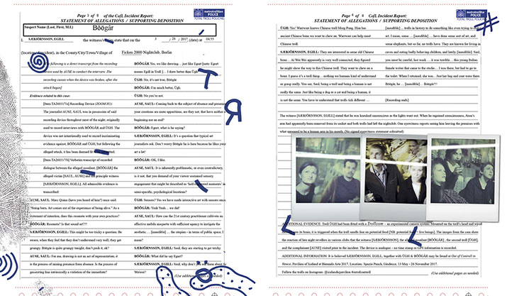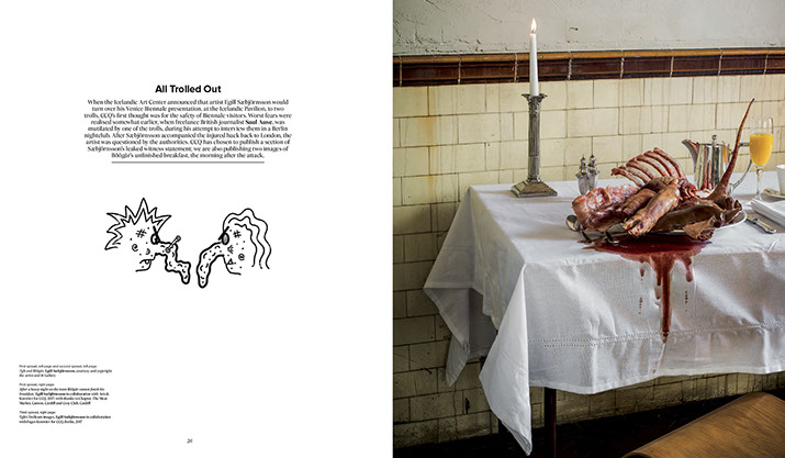 When the Icelandic Art Center announced that artist Egill Sæbjörnsson would turn over his presentation, at the Icelandic Pavilion for the 57th Venice Biennale, to two trolls, CCQ’s first thought was for the safety of Biennale visitors. Worst fears were realised somewhat earlier, when freelance British journalist Saul Ause, was mutilated by one of the trolls, during his attempt to interview them in a Berlin sex club. After Sæbjörnsson accompanied the injured hack back to London, the artist was questioned by the authorities. CCQ chose to publish a section of Sæbjörnsson’s leaked witness statement; CCQ also publishing two images of Bõögâr’s unfinished breakfast, the morning after the attack.