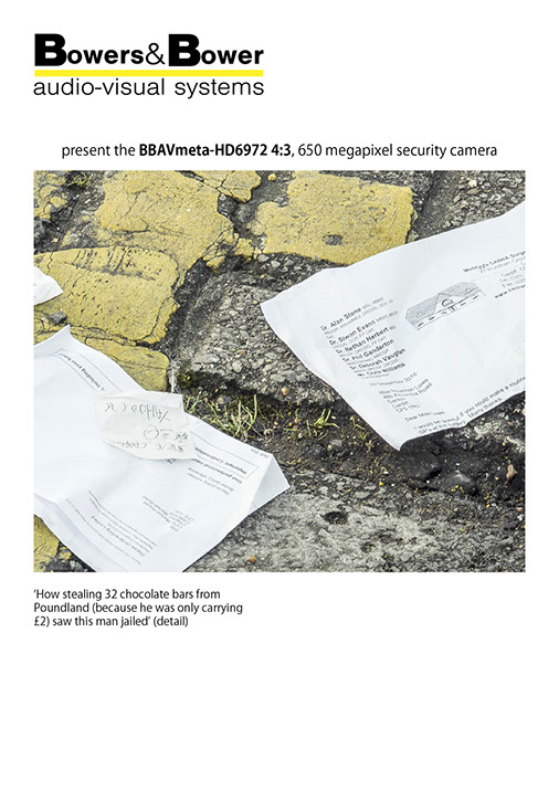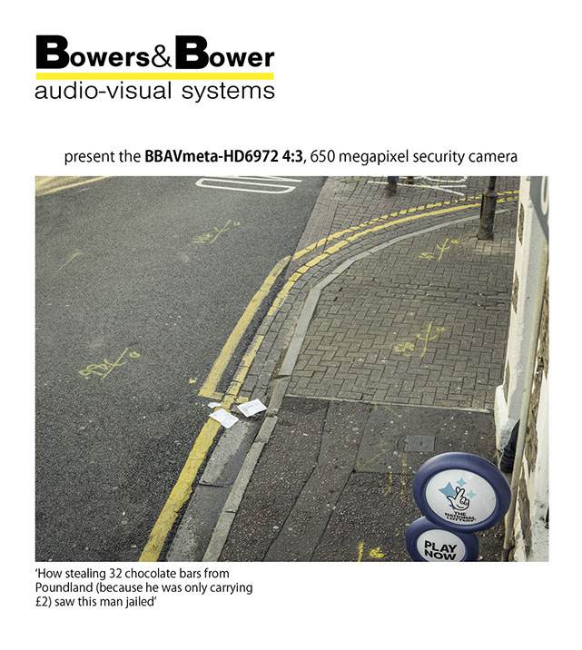 How stealing 32 chocolate bars from corner shop (because he was only carrying £2) saw this man jailed, the BBAVSmeta-HD6972 4:3 ultra high resolution security camera, Bower & Bower Audio Visual Systems, Richard Bowers and Ric Bower, 2016, multi section pigment print, 4m x 3m