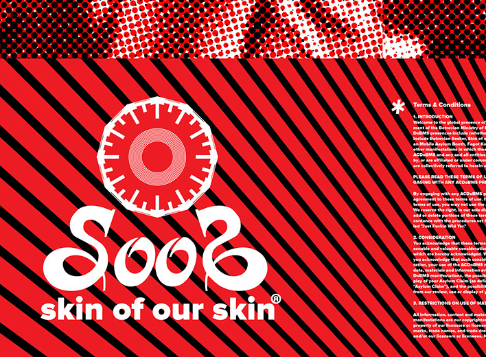 Terms and Conditions poster; (detail); Easy Asylum Booth, ‘Bundu Edition’, (presented by the Botrovian Ministry of Immigration trading as SooS® (Skin of our Skin)); Supercharger-blown collective (in collaboration with Nástio Mosquito); 2020