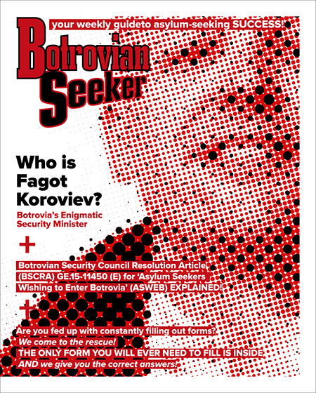Benefits to refugee status include a direct telephone connection with the Botrovian Leader (‘Our Leader is Available’); Training in ‘DASHT (Drone Asylum Seeker Herding Techniques)’ with a fully featured computer game; a lifetime subscription to ‘Botrovian Seeker (Your Guide to Asylum Success)’ plus access to numerous helpful and supportive infographics, interviews and seminars.