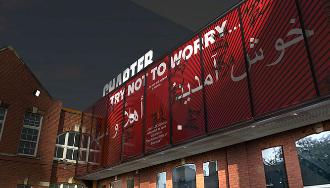 Welcome Lightbox ; artist’s impression; Easy Asylum Booth, ‘Bundu Edition’, (presented by the Botrovian Ministry of Immigration trading as SooS® (Skin of our Skin)); Supercharger-blown collective (in collaboration with Nástio Mosquito); 2021