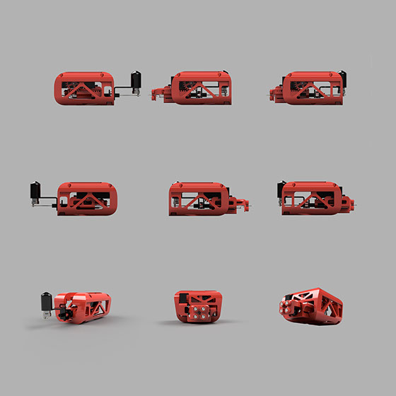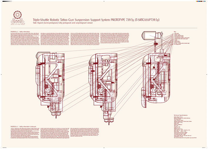 Triple-Shuttle Robotic Tattoo Gun Suspension Support System PROTOTYPE 739.5y, (T-SRTGSSSP739.5y) Side Aspect; (semi-prolapsed, fully prolapsed and unprolapsed views); Supercharger-blown collective (in collaboration with Nástio Mosquito); 2021